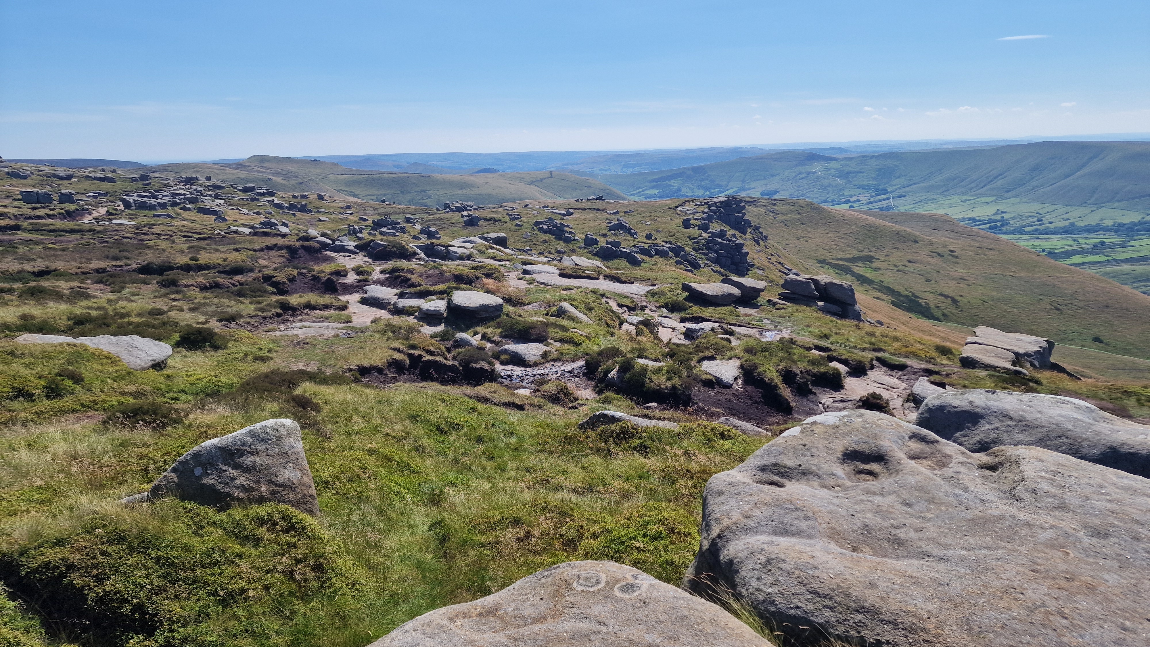 Kinder is a large flat plateau surrounded by steep edges. This walk follows the edges along the north of Kinder. These rock edges here, mark the northern limit of Kinder and create an edge with a significant drop. From here views north towards Bleaklow are extensive on days of good visibility. The return is a lovely walk down the Snake Path alongside Ashop Clough.