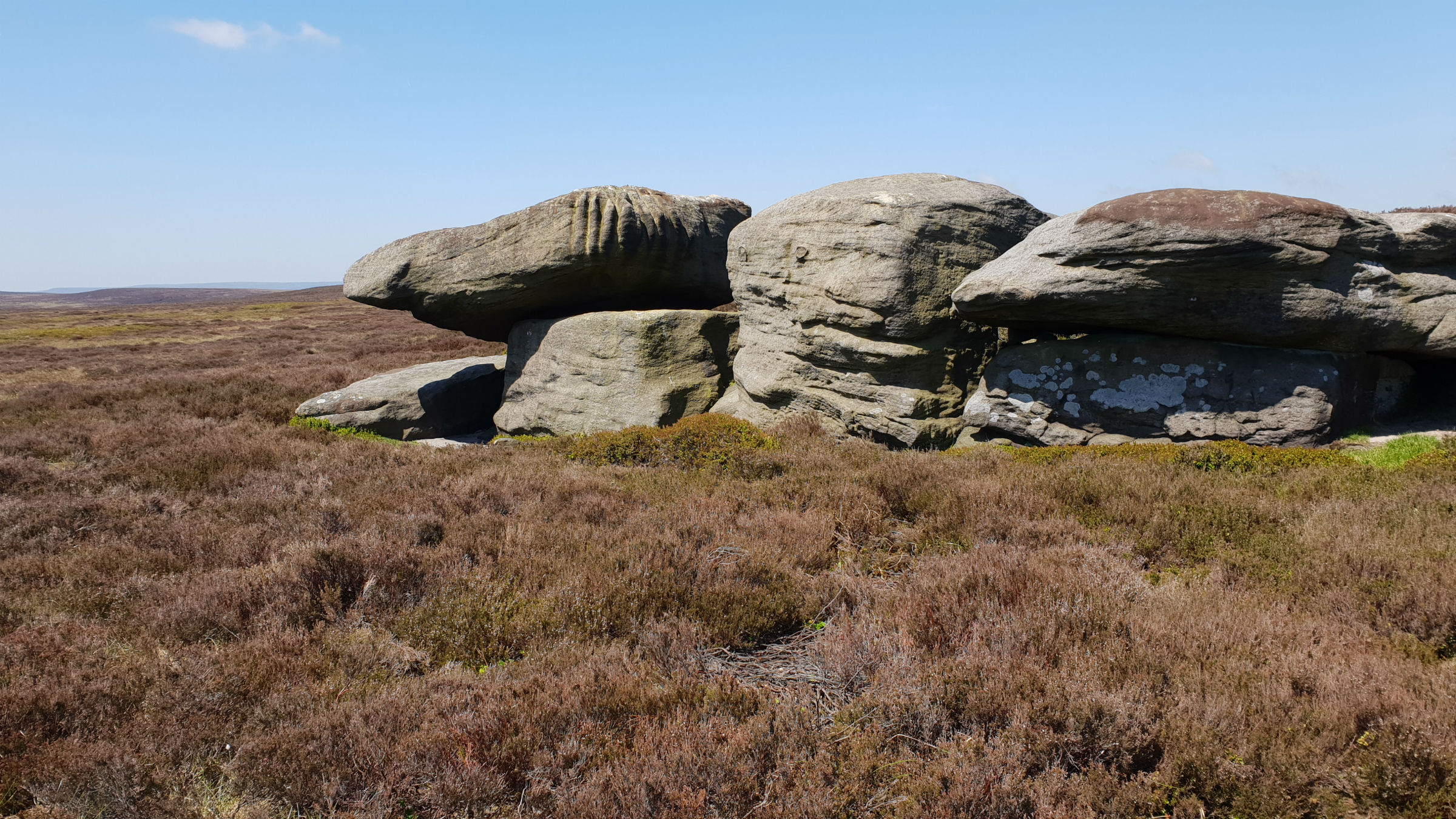 1st May 2019 There has been a fair amount of rain recently but the ridge was not seriously wet. I missed the diversion down to Horse Stone and I followed the ridge the full length to Outer Edge and then Cut Gate. There are reasonable paths all along the ridge much improved with the conservation work of damming the groughs and installing hessian sacks along the path. Apart from around the honey-pot of Kings Tree I saw no other walkers which was surprising as this was a nice spring May Day.