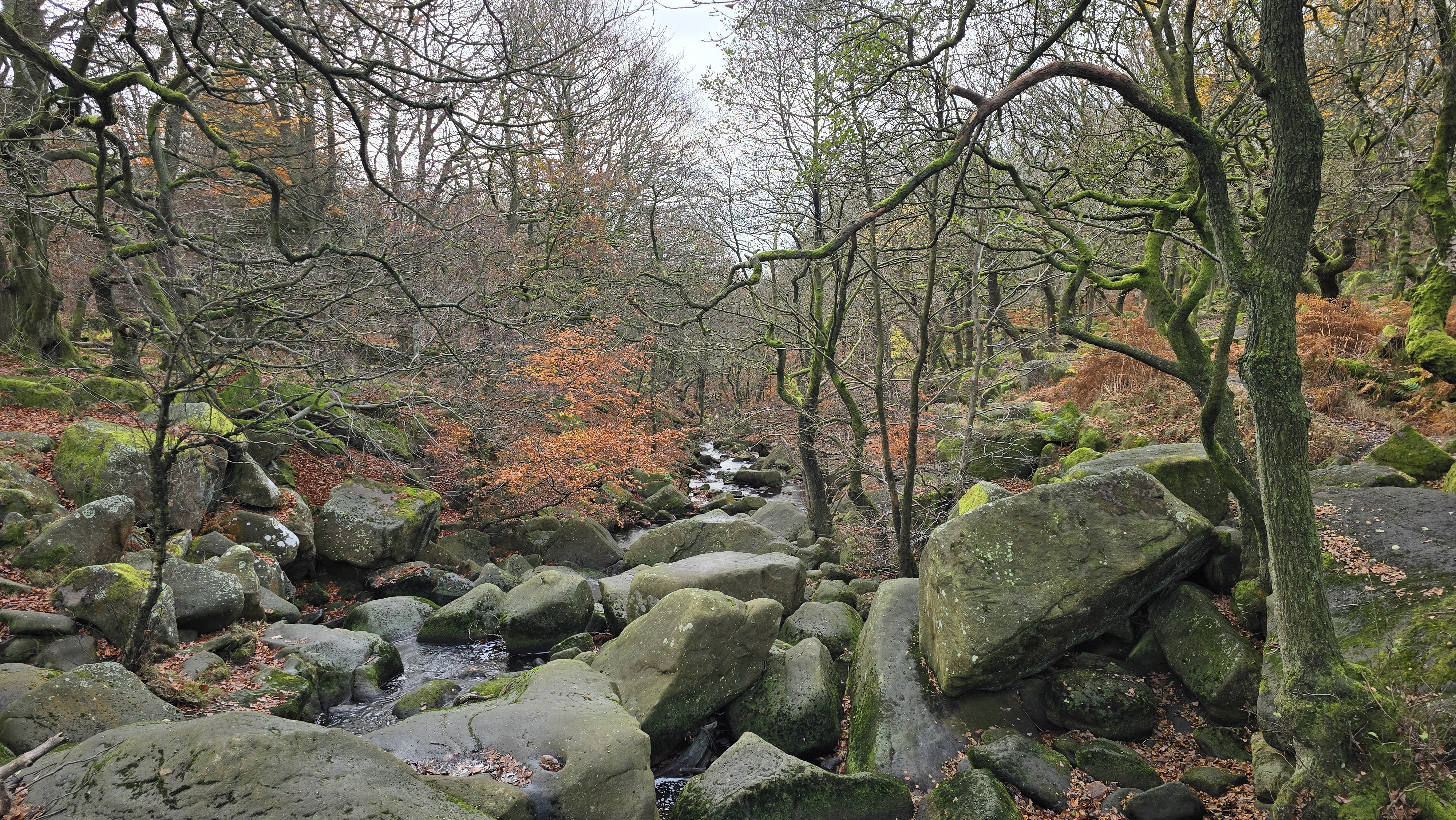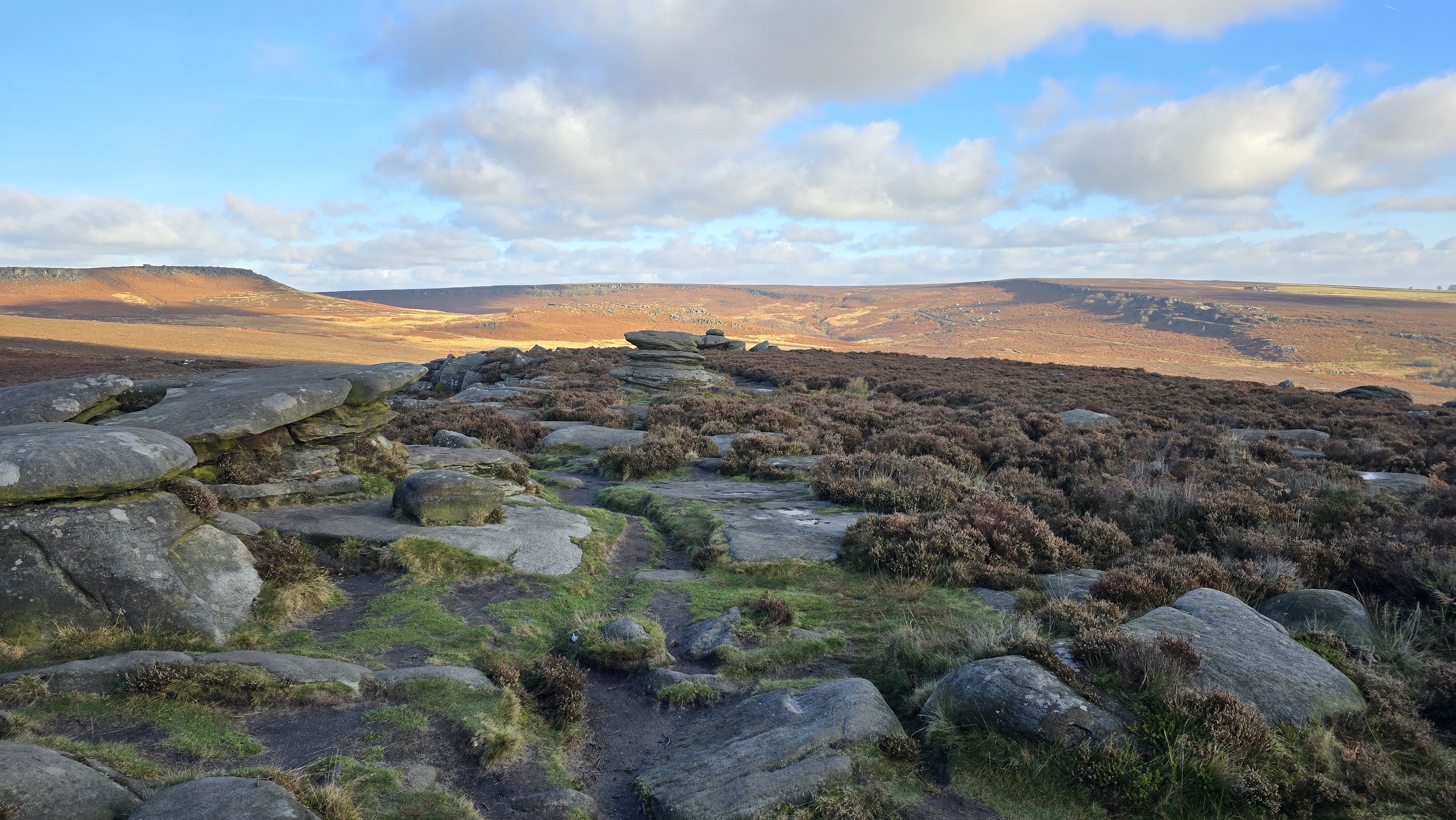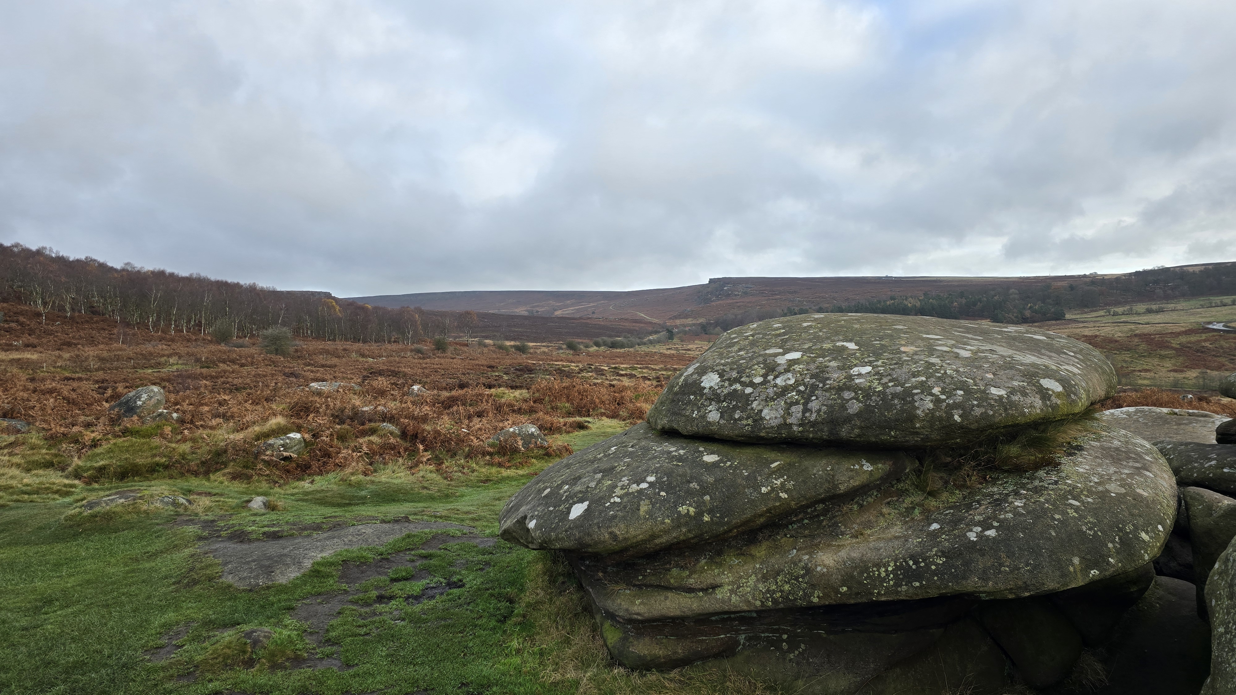 14th November 2024 For a change I walked this route clockwise rather than anti-clockwise which is described here. Autumn was nearly over but the walk down Padley Gorge was spectacular, covered in brown leaves. It was a morning walk and the sun was not shining on the rocks, the route is much better in the evening. But the walk under the rocks of Lawrencefield and Millstone was enjoyable. No rock climbers to see.
