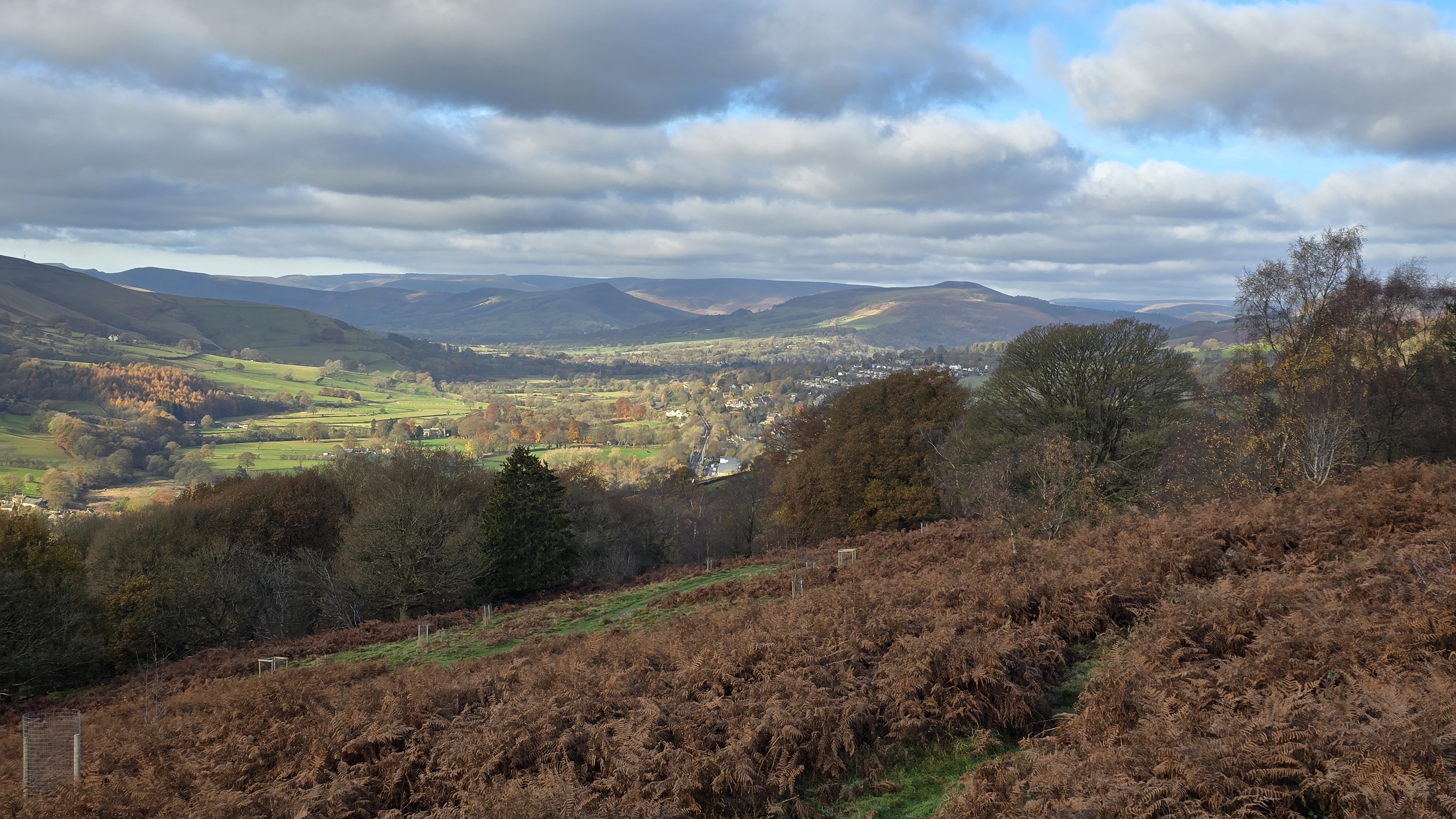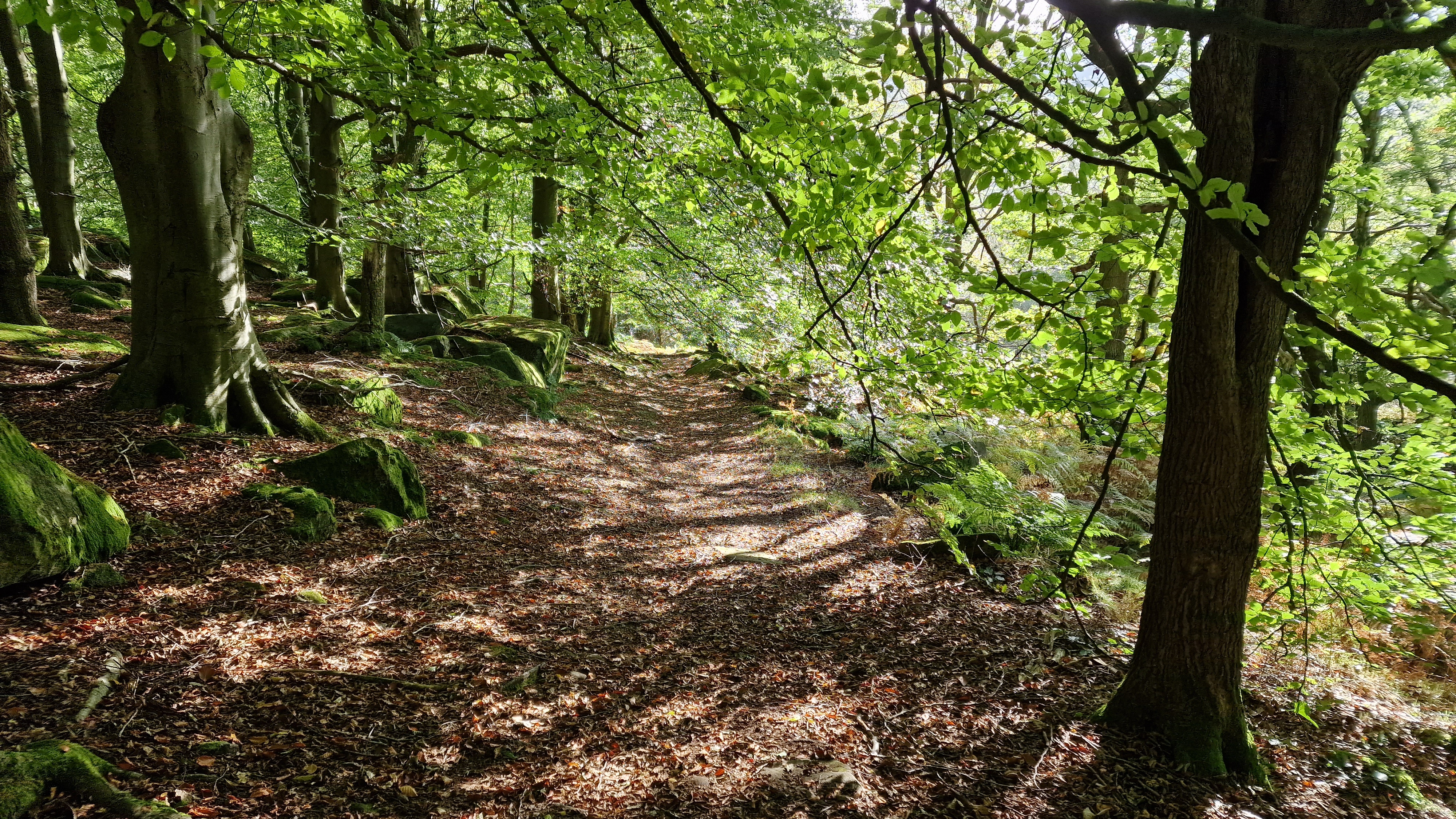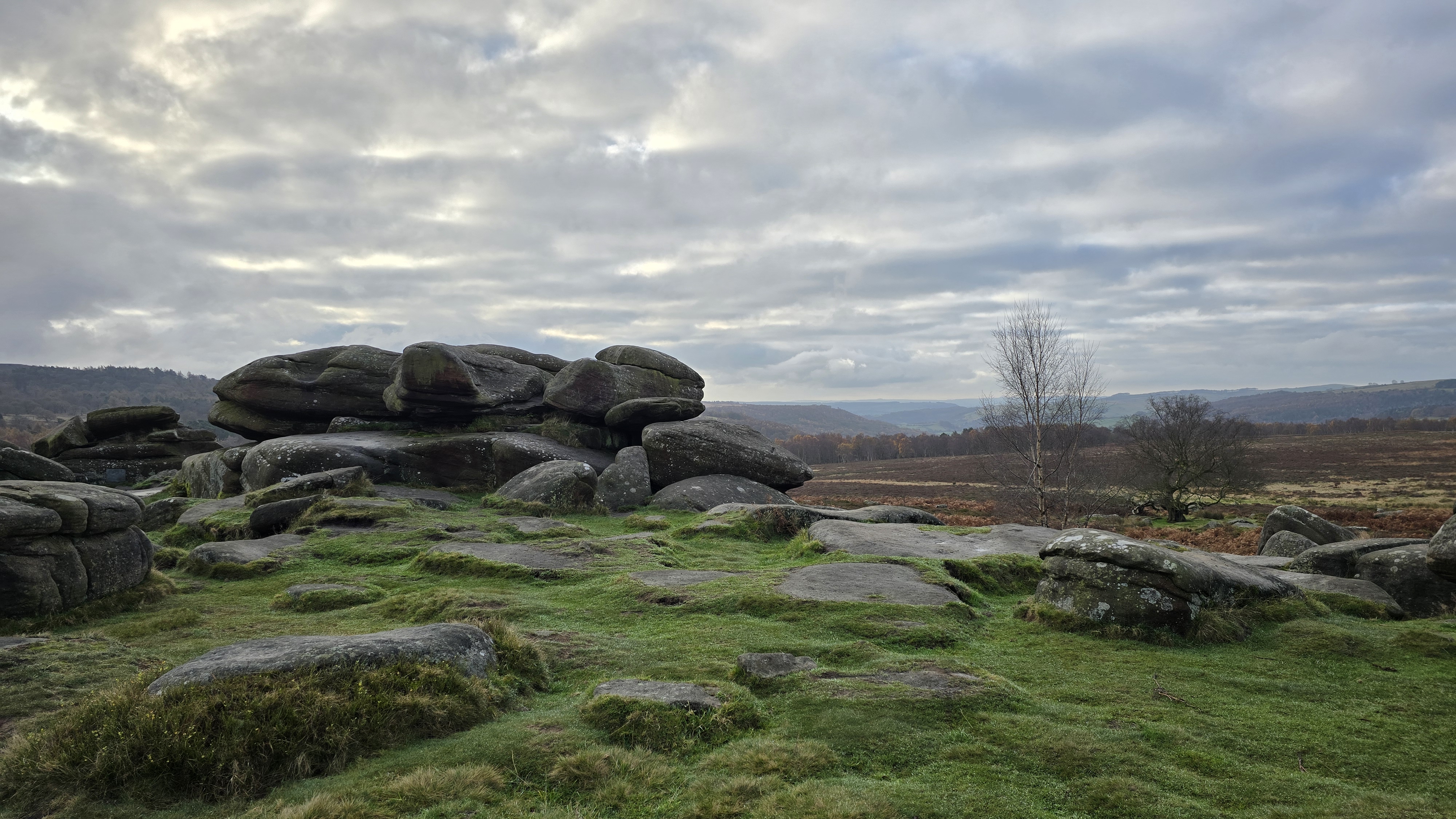 14th November 2024 For a change I walked this route clockwise rather than anti-clockwise which is described here. Autumn was nearly over but the walk down Padley Gorge was spectacular, covered in brown leaves. It was a morning walk and the sun was not shining on the rocks, the route is much better in the evening. But the walk under the rocks of Lawrencefield and Millstone was enjoyable. No rock climbers to see.