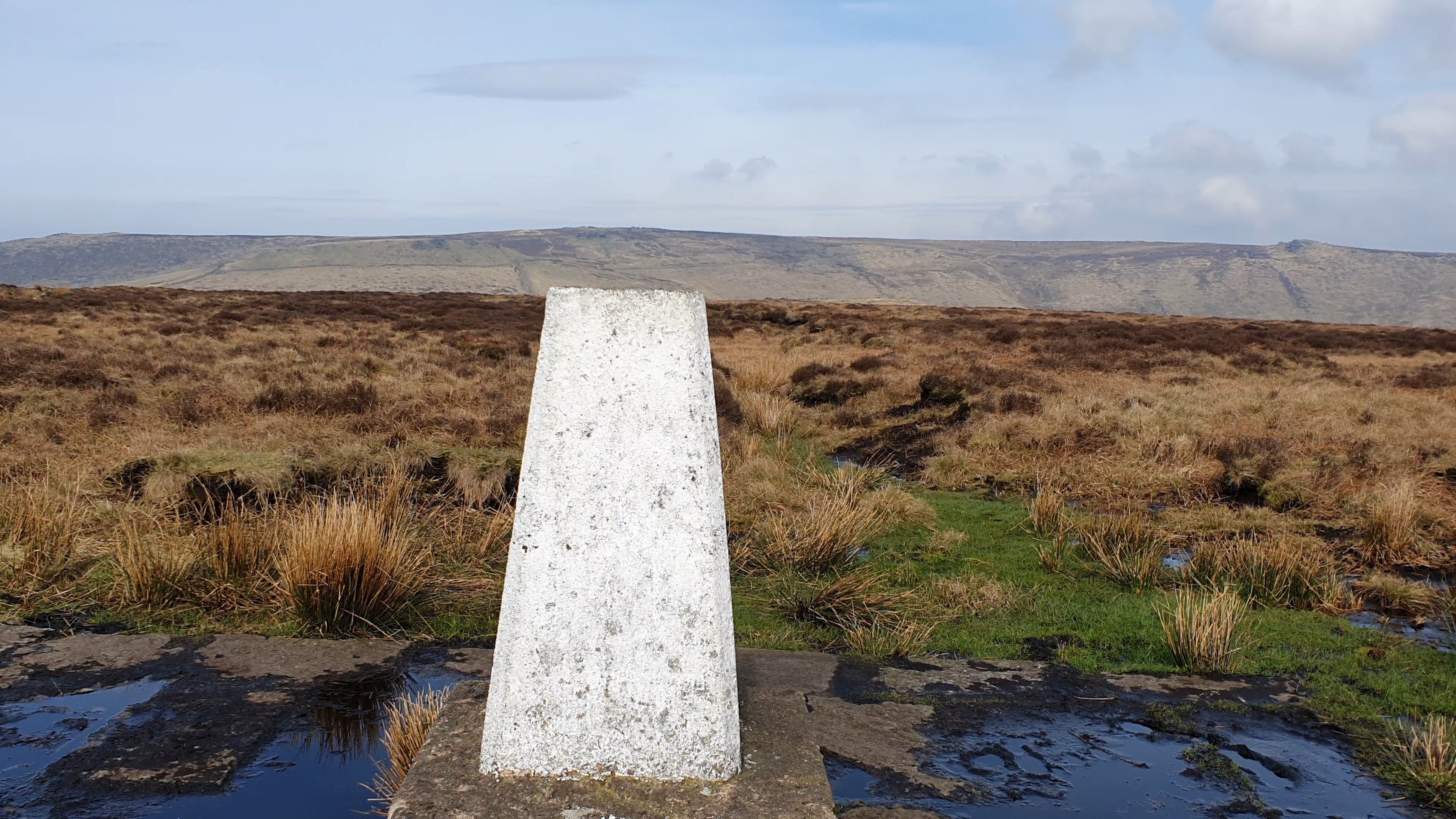 Once at the summit, follow the ridge down to the col between it and Brown Knoll. To the left, south, is limestone country and to the right, north is Dark Peak country. This route follows the path onto Brown Knoll which is definitely peat land. However the environmentalists have been hard at work and there is a stone path all the way from here over to Brown Knoll and beyond. The route crosses the rail tunnel that is well between your feet; taking the trains from Sheffield to Manchester. An obvious tower over to the south marks a ventilation shaft to the tunnel. Continue along the path the trig point at Brown Knoll.(5kms. 100m. 1hrs. 40min.)