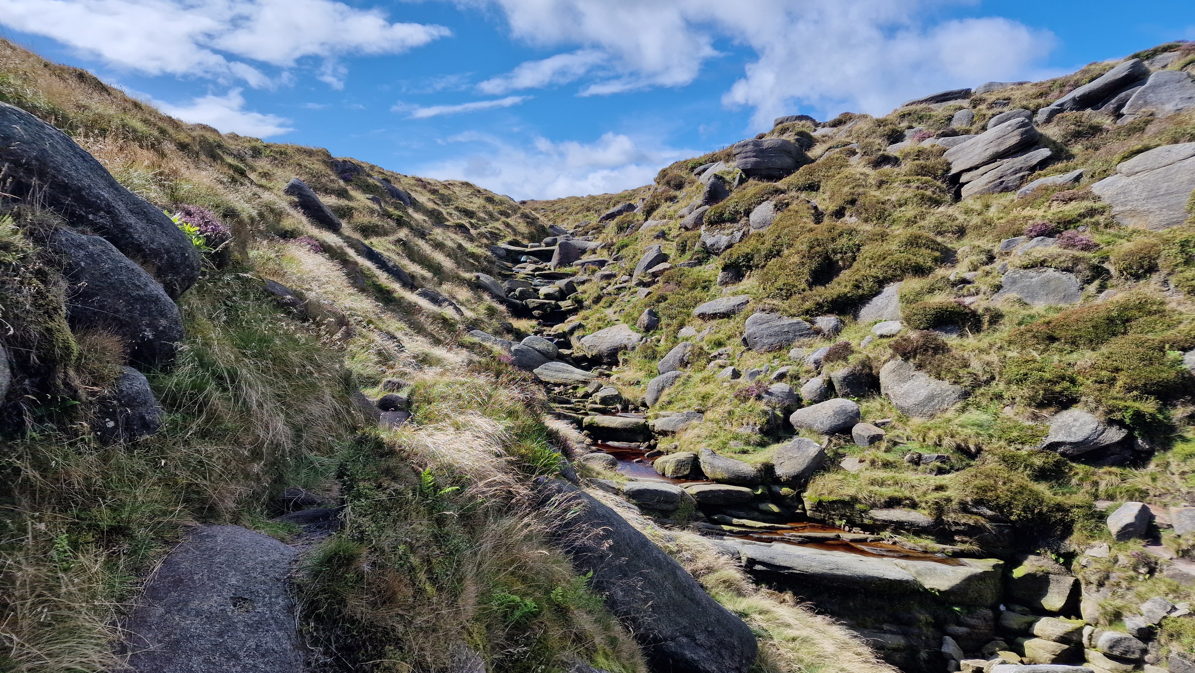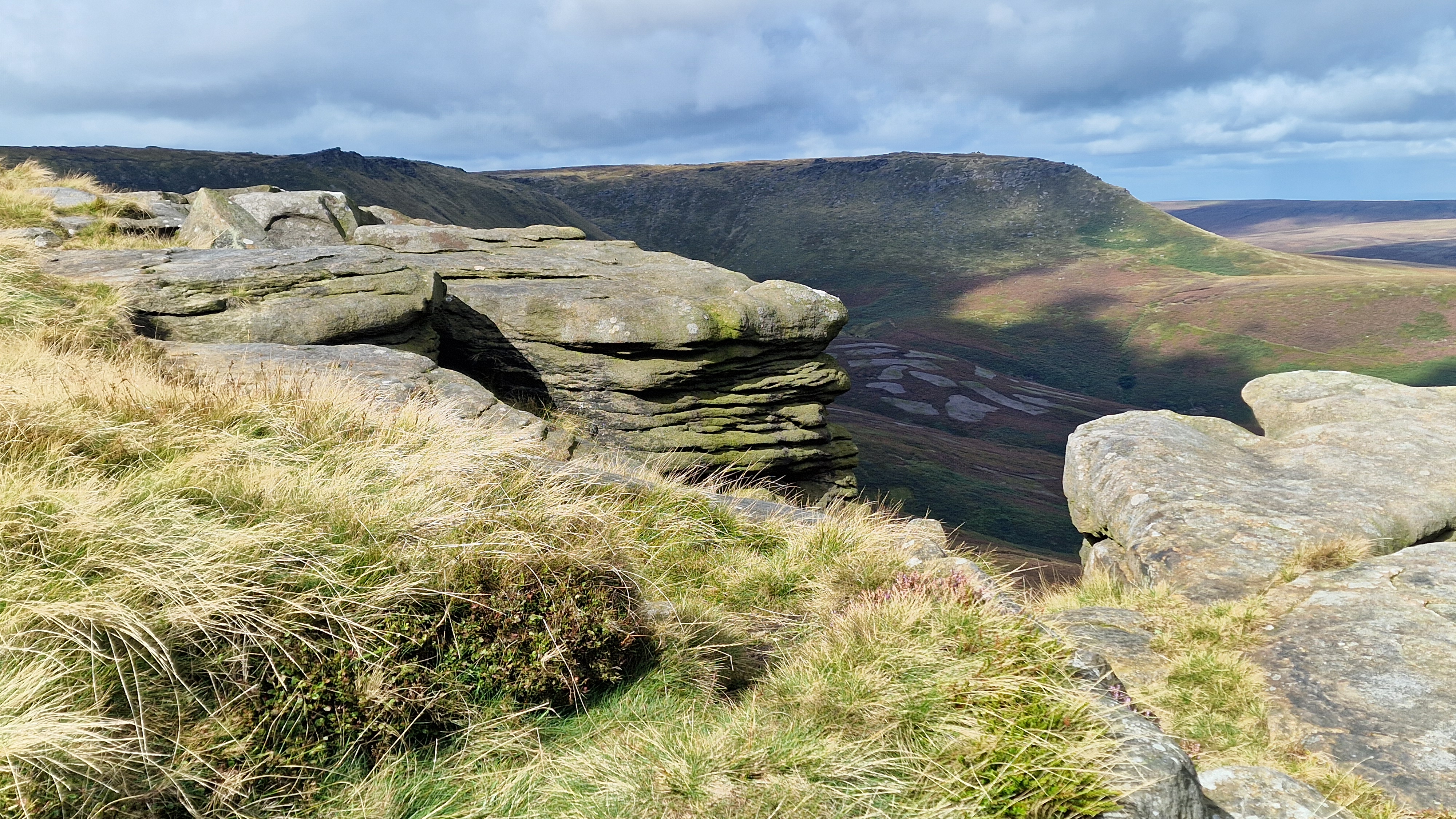 Kinder is a large flat plateau surrounded by steep edges. This walk follows the edges along the north of Kinder. These rock edges here, mark the northern limit of Kinder and create an edge with a significant drop. From here views north towards Bleaklow are extensive on days of good visibility. The return is a lovely walk down the Snake Path alongside Ashop Clough.