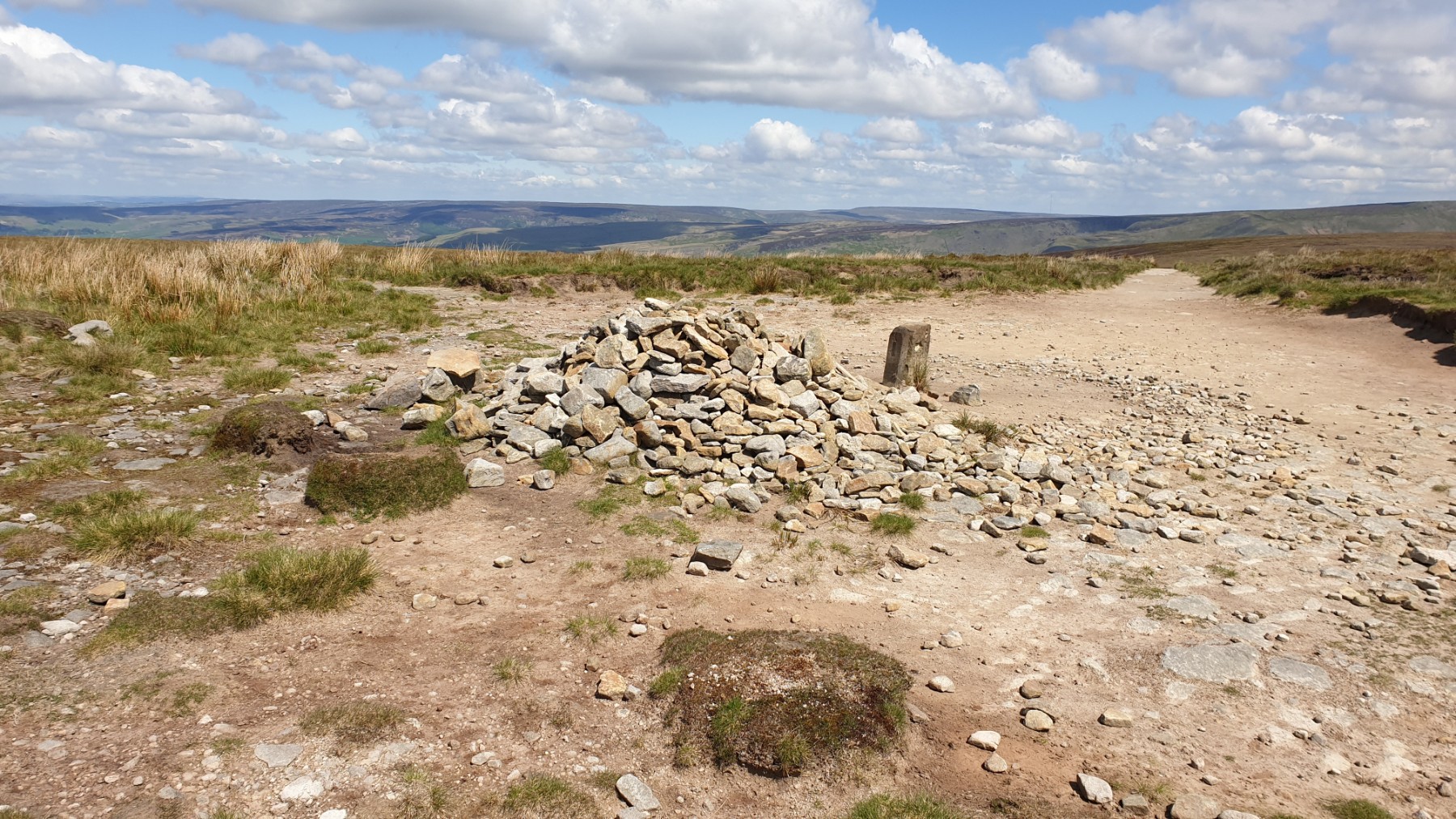 You can walk up the road to the Snake Summit, from Doctor's Gate, but best to get away from the road. Follow the well marked path up Doctor's gate until it meets the Pennine Way. From here walk south to get to the Snake Road. Cross the road and through the gate. There is a well made path (Penine Way_) all the way to Mill Hill but it is better to strike off left to get to the summit of Featherbed Moss. There is a great all around view from this summit. From here walk over the moor back to the Pennine Way and then follow the paved path all the way to the summit of Mill Hill. A relaxing walk with views of the north of Kinder. Remember to turn around to see Bleaklow over the Snake road. The top of Mill Hill is marked with a small pile of stones and a marker. One of the least impressive summits ever. (4.0kms. 140m. 1hrs. 30min.)