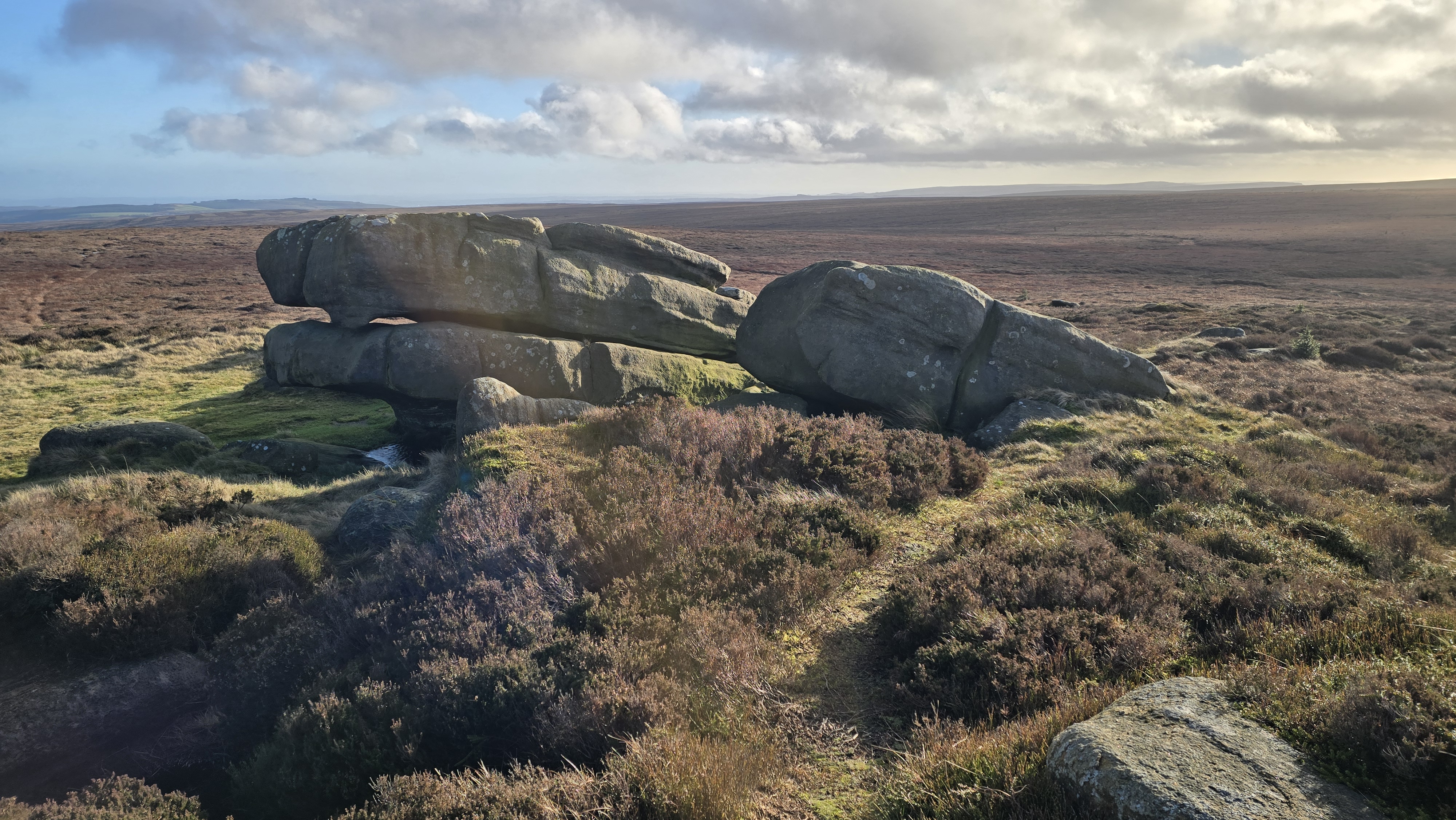 There is a sense of remoteness in this area of the Peak District. Away from the paths the moors can be challenging with the areas of heather, bracken and in particular peat. But the challenge is worth it with a great day out in the moors. The Woodhead pass is to the north and it seems perculiar to see the lorries pass over the distant moor on their way from Barnsley to Manchester. Cut gate is an old track climbing high over hills originaly used for travelling from South Yorkshire to Derbyshire. This route starts off up Cut Gate climbing to the top of the moors.