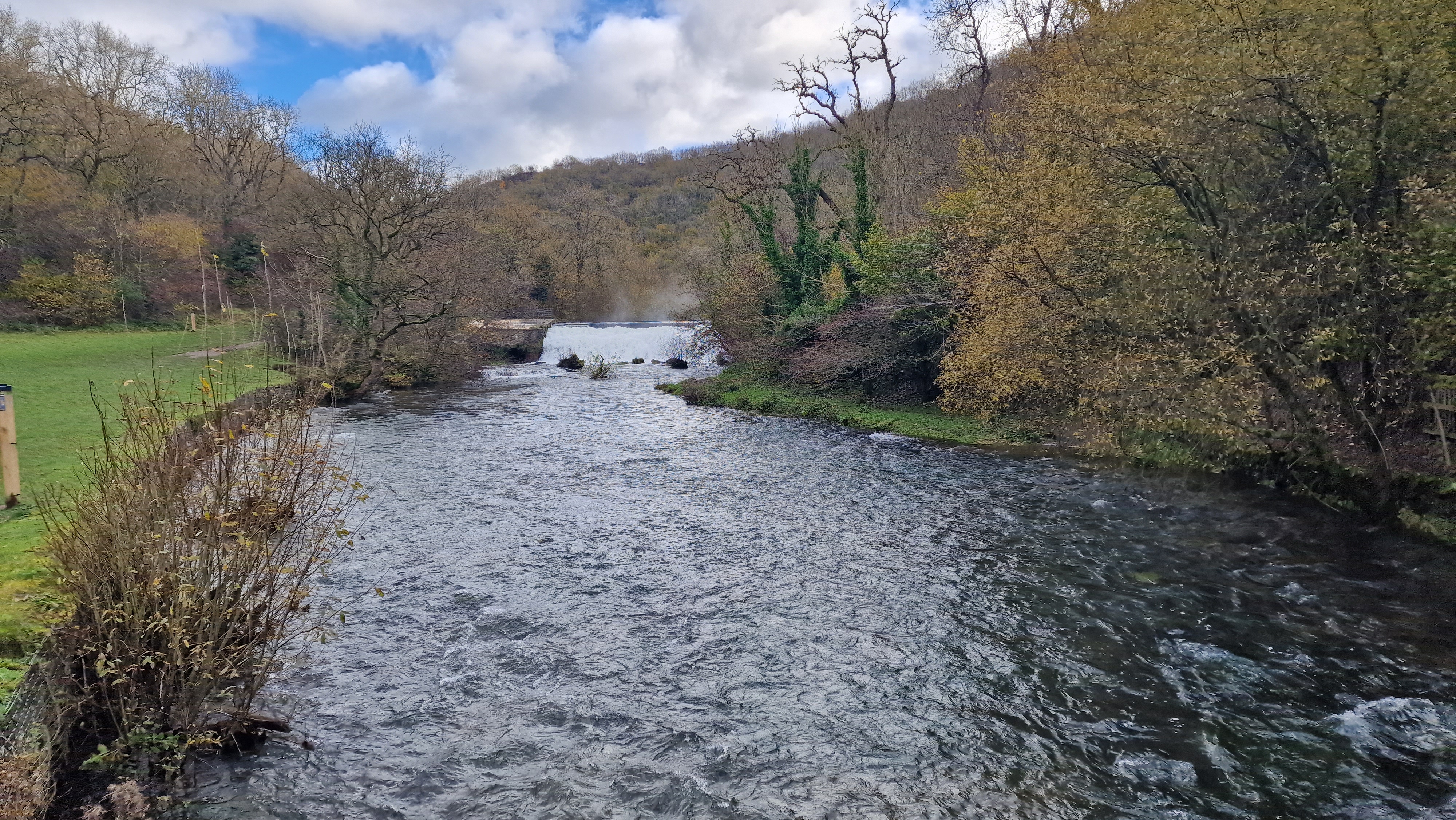 Walk out the back of the car park and take the road on the right - signed to Monsal Head. The first part of the path goes up through the fields to get to Pennyunk Lane. This is well marked but muddy. Maybe better to start at the beginning of the lane further up the road in the village. Follow the paths through the typical White Peak fields over to hit Hobs House Wood. The path goes along the top of the wood with views of Monsal Dale. At the signpost choose Monsal Dale and not Monsal Head. Walk back through the wood itself until you get to the river. A very noisy sound of the weir, which can be spectacular after a lot of rain. (4.0kms. 160m. 1hrs. 30min.)