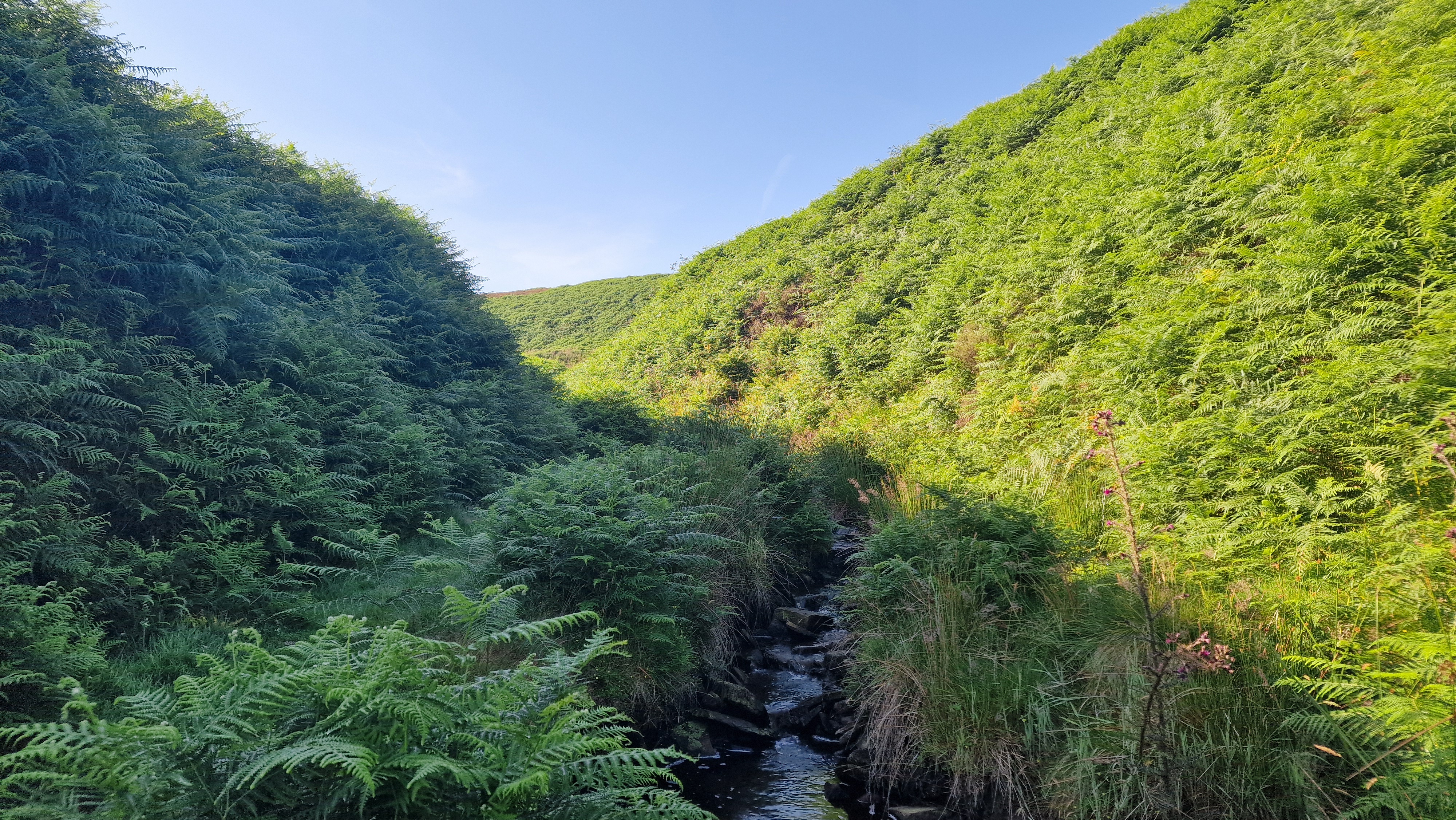 From Great Tor follow the edge of the rocks south east. Just prior to the end of the edge there is a path junction, the right hand path descends to the minor road. The route takes the left hand path that climbs slightly to the skyline, with an excellent view over to Stanage Edge. The way back is over Bamford Moor but despite the illusion on the map, the paths over the moor do not exist in reality, and the bottom ground is usually very wet. Walk south, towards the quarry. From there follow the track over the moor just south of the high point of Bamford Moor. This track leads to the point where the right of way meets the wall on the map. From here follow the wall north and when the wall disappears, there is a line concrete posts. Follow these until the track reaches the top of a line of grouse butts on the right. Follow the path beside these grouse butts downhill to reach Jarvis Clough by the broken down cabin. This land over the moor is heather based and it is regularly cut and burnt so it is short and good to walk through. There are a number of tracks around, created by the vehicles used in support of grouse shooting. Cross the brook just below the cabin, and follow the track back through the forest to reach Cutthroat bridge. Then again catch the path back to the lay-by. (4.5kms. 20m. 1hrs. 20min.)